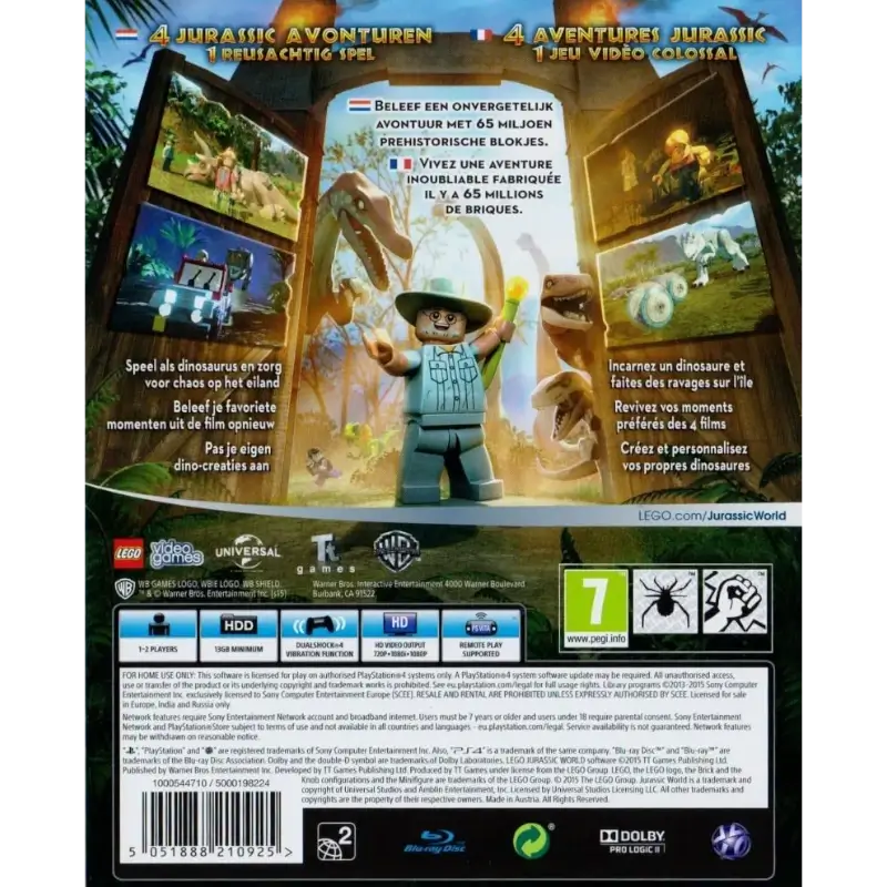 LEGO Jurassic World é um jogo de ação baseado nos quatro filmes do Parque Jurássico e lançado juntamente com o filme Jurassic World de 2015. Tal como com muitos outros títulos Tt Games, adapta uma franquia licenciada a um mundo construído a partir de tijolos LEGO. O jogo consiste em 20 níveis, cinco para cada um dos filmes, jogados em sucessão. O jogo toma emprestados muitos momentos icónicos dos filmes utilizando os clips de áudio originais e acrescenta frequentemente uma reviravolta humorística.