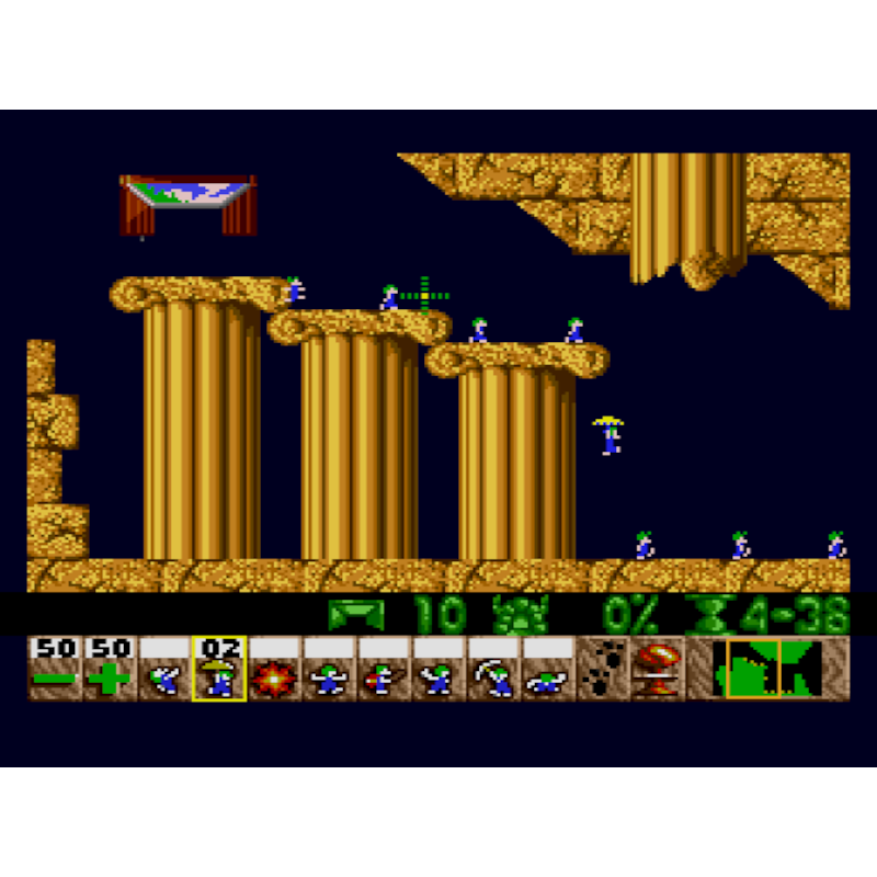Você não está no controle de nenhum Lemming individual, mas de uma mira, que pode ser movida sobre qualquer um dos Lemmings. Ao longo da parte inferior, há uma seleção de funções que podem ser atribuídas a um Lemming, incluindo escalar, flutuar e bater. Você deve clicar para selecionar a função apropriada e, em seguida, clicar no Lemming para ativá-lo. Cada nível oferece uma gama diferente de habilidades, uma quantidade diferente de Lemmings e uma meta percentual diferente para progredir.