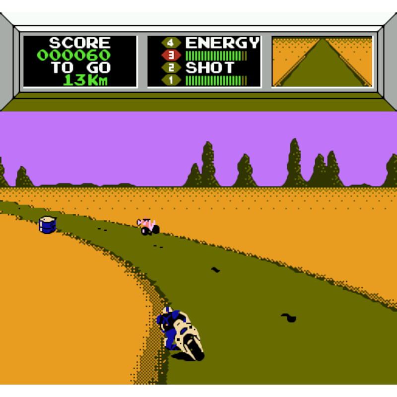 Os jogadores, representados por Mach Rider, devem percorrer dez setores para chegar à cidade antes que ela seja tomada pelo inimigo. Motoristas agressivos tentam tirar os jogadores da estrada; obstáculos, como pedras, e as muitas curvas da estrada também podem fazer com que os jogadores se desviem do curso. Se destruído, Mach Rider se reformará para poder continuar.
