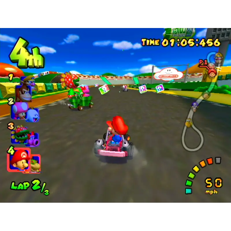 É o quarto título principal da série Mario Kart e destaca-se por introduzir uma mecânica inovadora: pela primeira vez, cada kart é conduzido por dois personagens ao mesmo tempo. Esta mudança adiciona uma nova camada de estratégia à jogabilidade, já que um personagem conduz o veículo enquanto o outro utiliza os itens recolhidos na pista. Os jogadores podem trocar de posição durante a corrida, permitindo combinar personagens com habilidades e itens únicos.