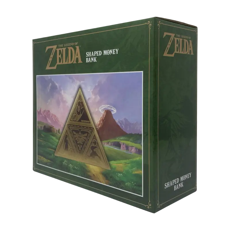 Com design inspirado no lendário símbolo da Triforce, ele apresenta um acabamento detalhado, geralmente em tons dourados, que remete ao poder, coragem e sabedoria presentes no jogo. O mealheiro costuma ter uma forma geométrica elegante, reproduzindo o triângulo tripartido da Triforce de maneira fiel e visualmente impactante, tornando-o ao mesmo tempo funcional e decorativo.