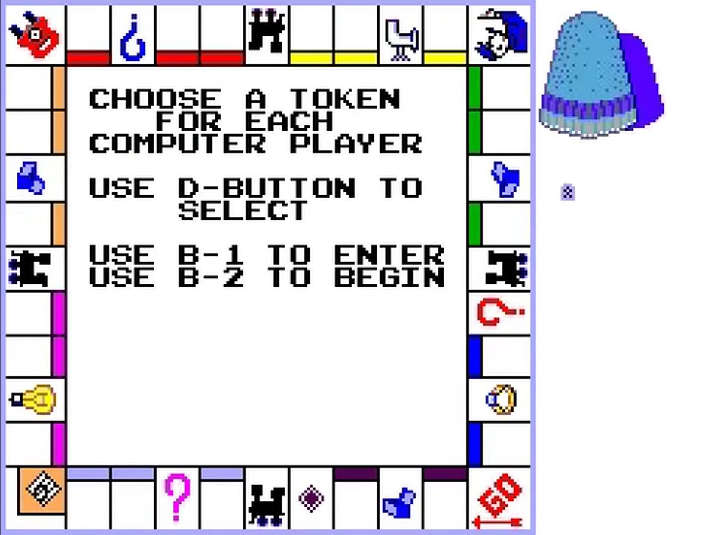 O tabuleiro de jogo tem visão top-down e preenche a tela, com exceção de uma barra à direita reservada para uma imagem do símbolo do jogador atual, nome e reserva de caixa, bem como o número de casas e hotéis restantes no banco. O movimento de tokens ao redor do quadro é visto em uma animação especial que pode ser interrompida. As opções disponíveis durante o turno de um jogador são selecionadas em um menu. O cartucho do jogo contém uma bateria para salvar um jogo em andamento.