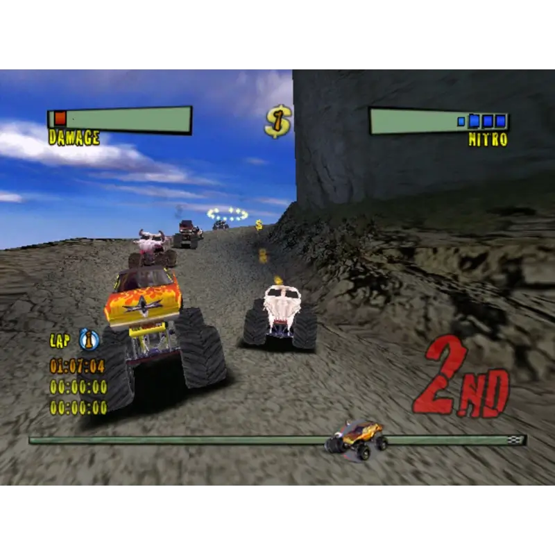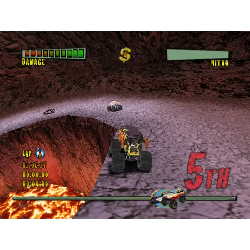 Monster Trux Extreme Arena Edition PS2 é um jogo de corridas off-road focado em caminhões monstruosos (monster trucks).
