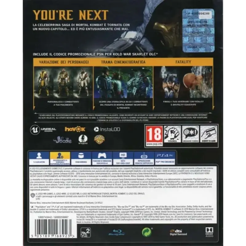 Em Mortal Kombat 11 para PlayStation 4, os jogadores podem enfrentar adversários em combates um contra um, usando uma variedade de movimentos especiais, combos e fatalities personalizáveis. O jogo inclui modos de história cinematográficos, Towers of Time, Multiplayer online competitivo e edições de personagem exclusivas, oferecendo múltiplas formas de jogar e aprimorar habilidades. Cada lutador possui habilidades únicas e estilos de combate distintos, permitindo estratégias diversificadas em cada luta.