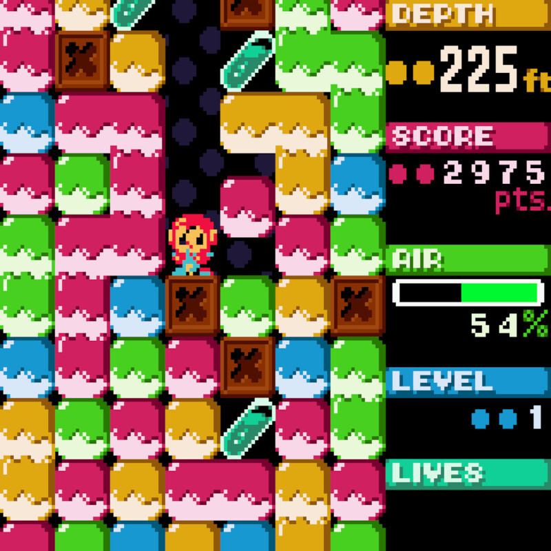 - Progressão e Pontuação: O objetivo é perfurar o mais profundo possível, evitando ser esmagado e mantendo o nível de oxigênio. A profundidade e a eficiência na remoção de blocos contribuem para a pontuação final.
