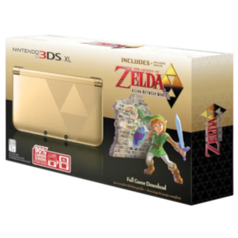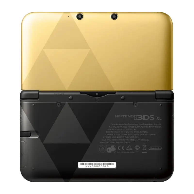 Nintendo 3DS XL The Legend of Zelda A Link Between Worlds, com um design ergonómico e de maiores dimensões, a Nintendo 3DS XL foi concebida para oferecer uma experiência de jogo mais confortável e envolvente, ideal para jogadores que procuram longas sessões de entretenimento portátil. Esta edição especial destaca-se pelo seu acabamento exclusivo dourado e preto, inspirado no universo icónico de The Legend of Zelda, com o emblemático símbolo da Triforce gravado na parte exterior da consola.