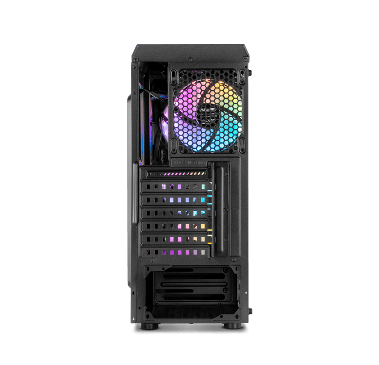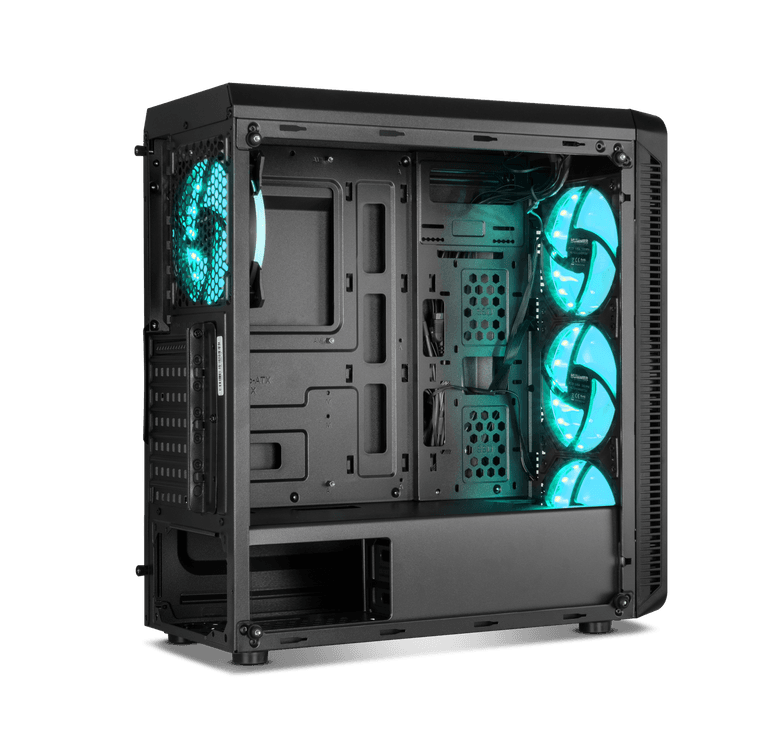 Uma semi-torre feita de aço com painéis de vidro temperado que atende às exigências daqueles que procuram personalidade e desempenho nos seus equipamentos. O painel superior incorpora duas portas USB 2.0, uma porta USB 3.0 e conexões de áudio. Também inclui um botão para controlar os modos de iluminação RGB do LED frontal e das ventoinhas