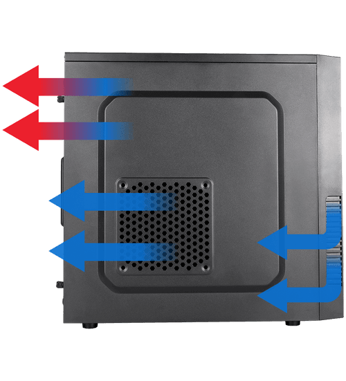 O Nox Forte possui uma grade em uma das laterais para a entrada de ar da fonte de alimentação. Tem capacidade para instalar até 3 ventoinhas: uma frontal de 120mm incluída, uma traseira de 80mm e uma lateral de 120mm.