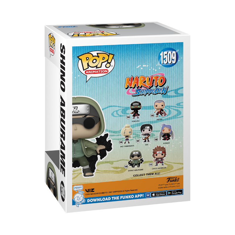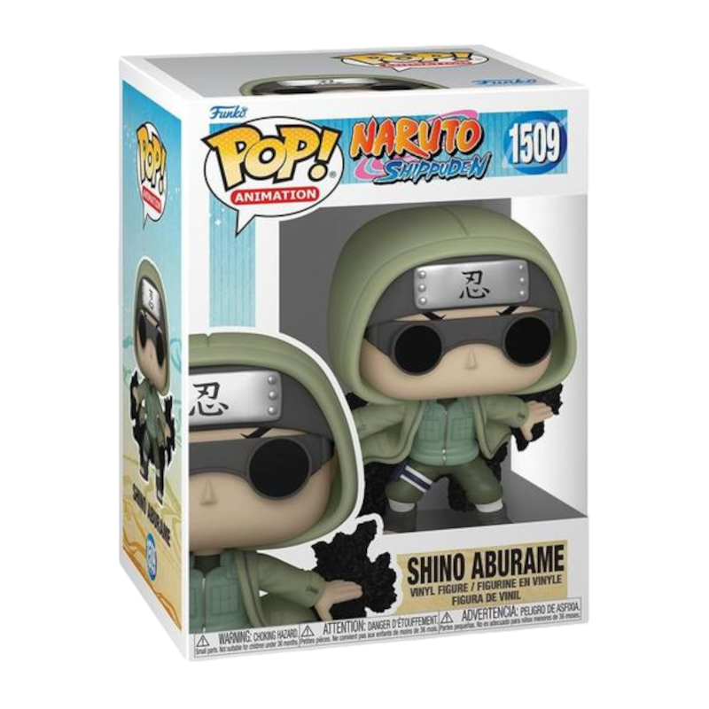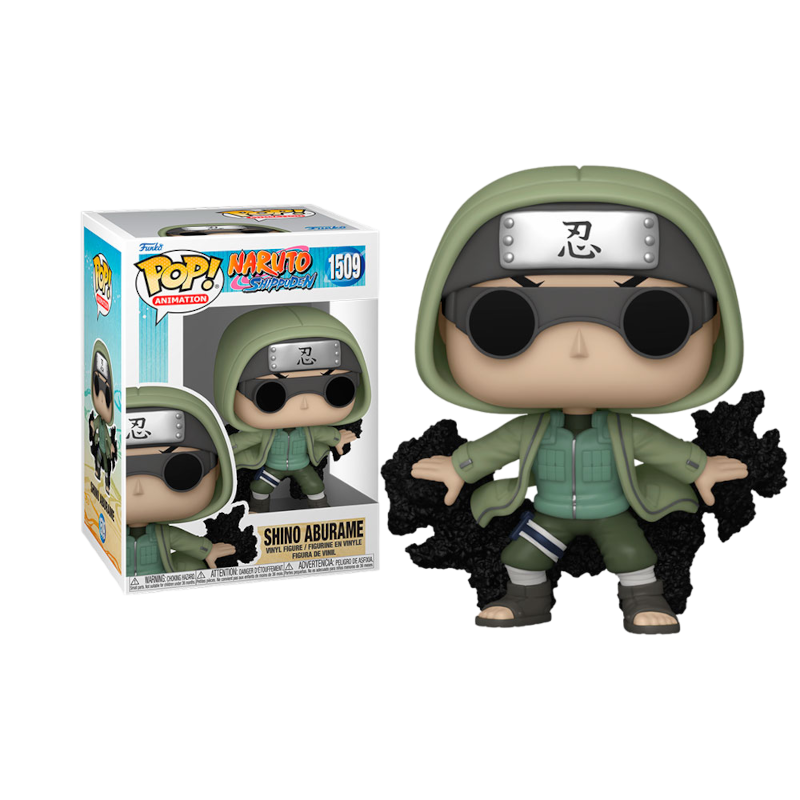 - Design: O Funko Pop! do Shino Aburame captura sua aparência distintiva com precisão. Ele é representado com seus óculos de sol escuros, o colarinho alto característico, e sua postura calma e confiante.