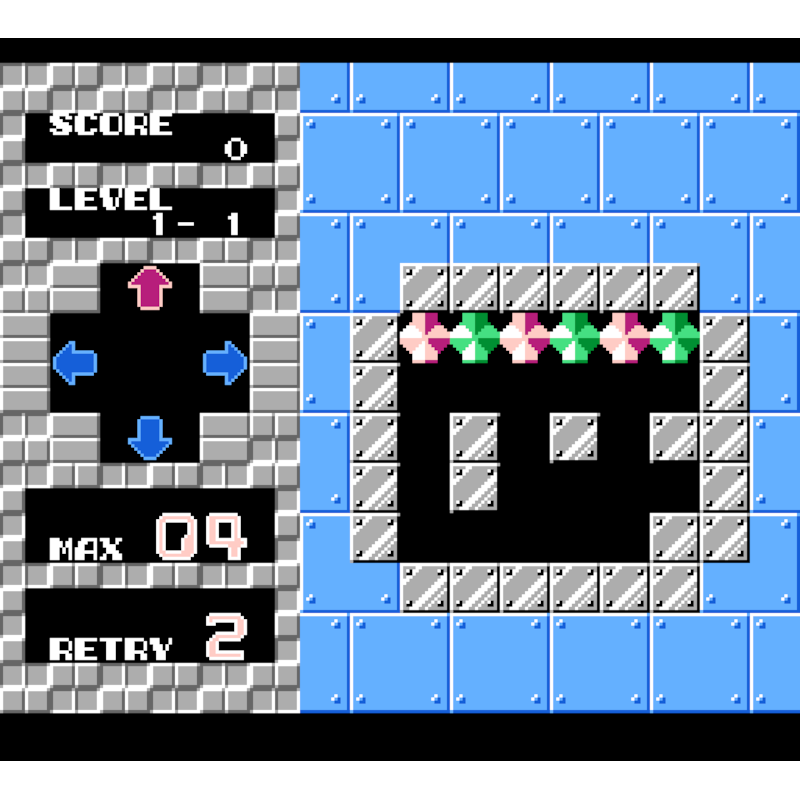 A estrutura do jogo é um pouco incomum, pois depois de completar cada lote de quatro níveis você pode escolher entre dois conjuntos de níveis – você está progredindo através de uma matriz de níveis em expansão, o que significa que há dois conjuntos no nível 2, três no nível 3 , quatro no nível 4 e assim por diante. Isso significa que há um total de 220 telas no jogo. Cada tela é jogada contra um limite de tempo, e perder um nível (seja por ficar sem tempo ou por fazer um movimento ruim e sair de uma posição impossível) perde uma de suas três vidas.