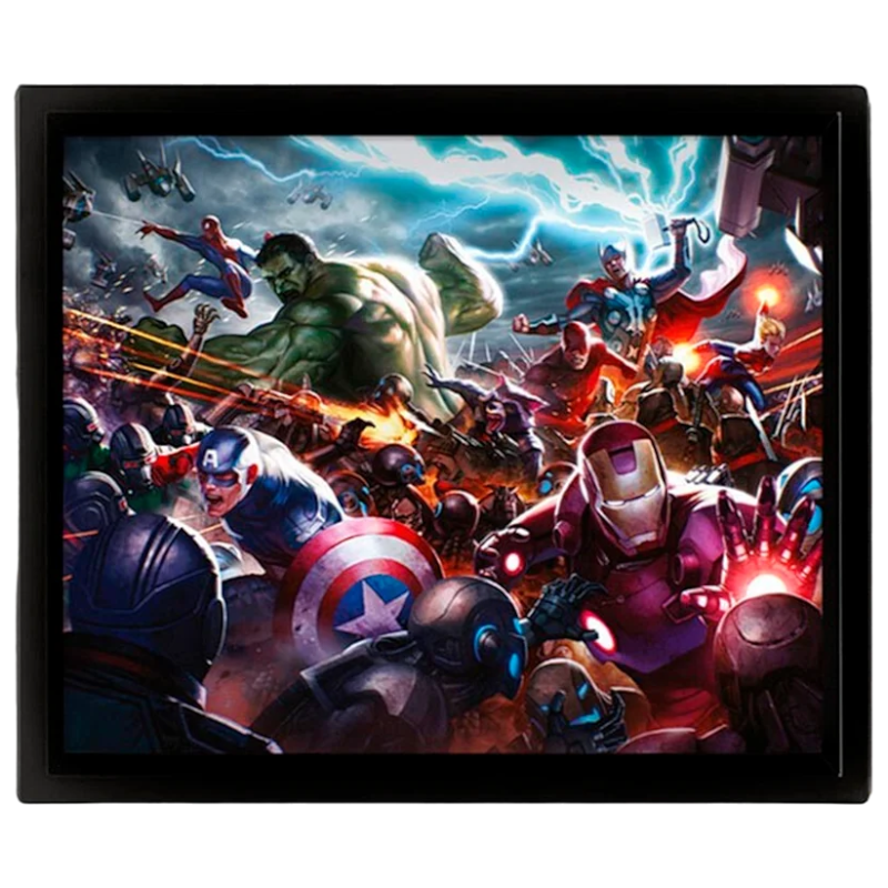 O quadro apresenta uma imagem lenticular de alguns dos heróis mais icónicos da Marvel, incluindo o Homem-Aranha, o Capitão América, a Viúva Negra e o Hulk. Quando visto de diferentes ângulos, a imagem parece ganhar vida, dando a ilusão de profundidade e movimento.