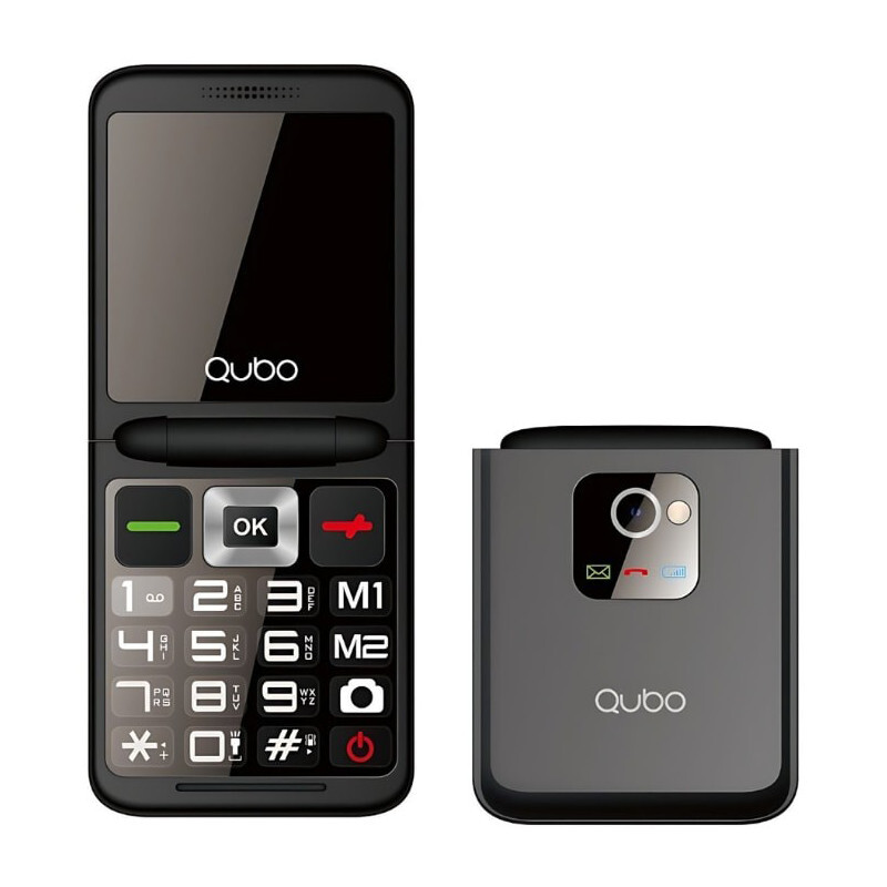 Telemóvel sénior QUBO X10 com ecrã 2,4” QVGA, teclas grandes, botão SOS, Dual SIM (2G), rádio FM, Bluetooth e lanterna.