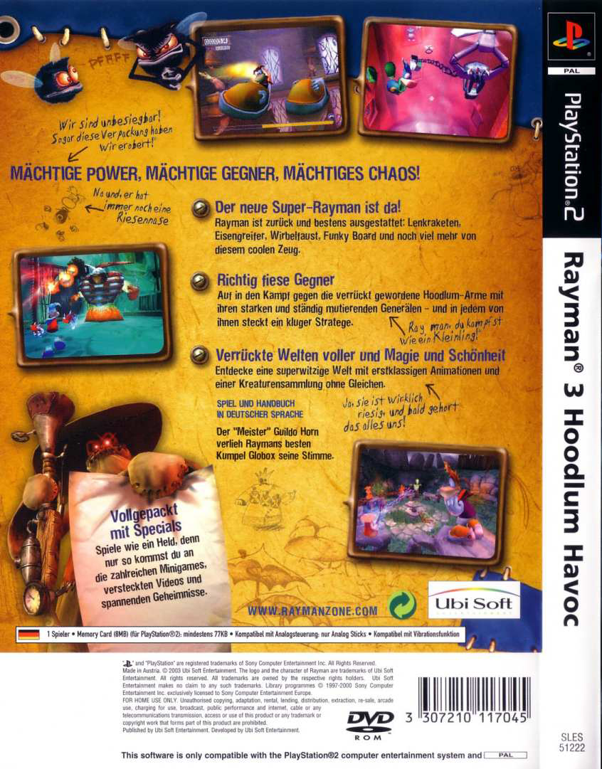 Rayman 3: Hoodlum Havoc é um jogo de plataforma 3D para terceira pessoa. Rayman, o herói principal, salta e dá murros através de inúmeros níveis coloridos, com a Globox (e André dentro dele) a acompanhar e ocasionalmente a comentar os acontecimentos. A arma principal de Rayman é o seu punho; ele pode usá-lo para disparar projécteis contra os bandidos atacantes e outros inimigos, e os projécteis são mais poderosos quando o punho é carregado segurando o botão “disparar”.