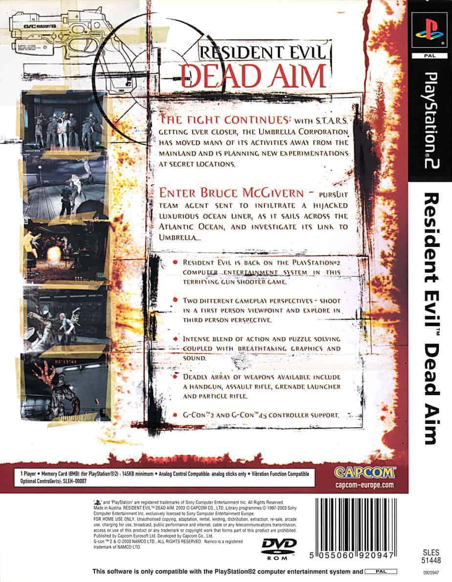 Numa combinação de um jogo de terror e de armas leves, Resident Evil: Dead Aim coloca-o num navio de cruzeiro infestado de zombies. Começa como Bruce McGivern, um agente do governo dos EUA enviado para impedir Morpheus D. Duvall de espalhar mais o T-vírus zombie. Ao longo do caminho, deparar-se-á com Fongling, um agente do governo chinês que está a bordo do navio de cruzeiro pela mesma razão, e também acabará por jogar como ela. Tudo o que precisa realmente de saber é que existem zombies e que tem de os matar.