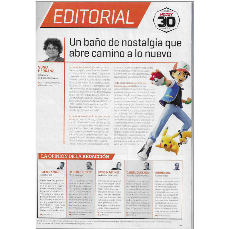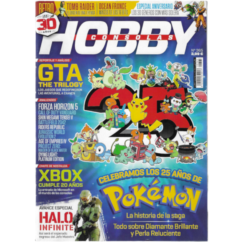 A Revista Hobby Consolas n365, lançada em dezembro de 2021, foi uma edição nostálgica que celebrou marcos importantes na indústria de videogames. Este número revisita a evolução de Pokémon, destacando os 25 anos da franquia, além de análises dos remakes de Pokémon Diamante Brilhante e Perla Reluzente. Outro destaque é a trilogia GTA: The Trilogy – The Definitive Edition, refletindo sobre o impacto dos três títulos da série Grand Theft Auto que revolucionaram o gênero de aventuras.