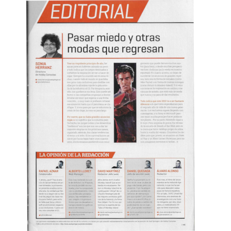 A revista Hobby Consolas n370, lançada em maio de 2022, destaca uma temática de terror em suas reportagens, com foco nos jogos de survival horror que dominarão o verão e o outono daquele ano. Entre os principais conteúdos, a edição explora mais de 20 jogos do gênero que estavam prestes a chegar às plataformas de console. Além disso, há uma análise sobre o sucesso da Nintendo ao longo de seus mais de 40 anos, uma celebração dos 20 anos do GameCube, e uma retrospectiva sobre a parceria entre LEGO e diversas franquias.