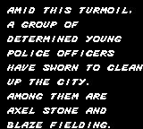 Streets of Rage, a resposta da Sega ao Final Fight, segue a história de três jovens policiais (Adam Hunter, Axel Stone e Blaze Fielding) em uma cidade controlada por um sindicato criminoso liderado por um “Sr. X” onde o crime é desenfreado, que leva os três heróis a fazerem um pacto para deixar a força e derrubar o sindicato por conta própria.