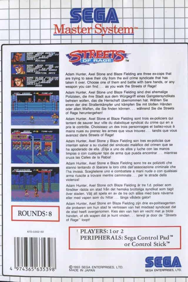 Streets of Rage, a resposta de Sega à Final Fight, segue a história de três jovens polícias (Adam Hunter, Axel Stone e Blaze Fielding) numa cidade controlada por um sindicato criminoso liderado por um “Sr. X” onde o crime é desenfreado, o que leva os três heróis a fazer um pacto para deixar a força e derrubar o sindicato por si próprios.