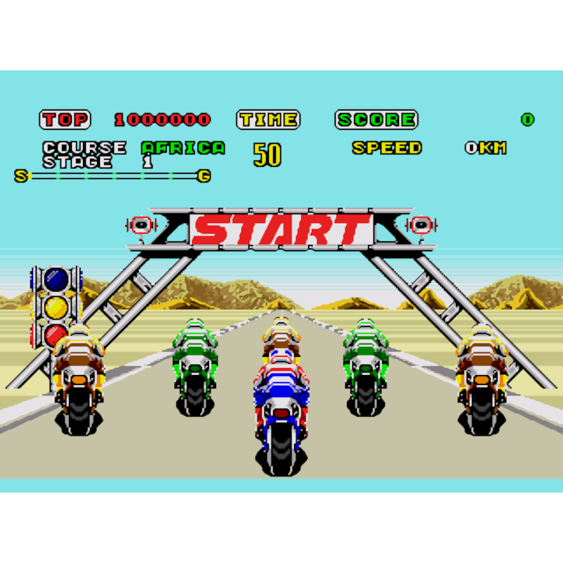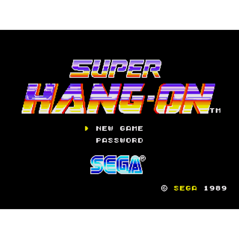 Em Super Hang-On, você pilota uma motocicleta ao redor do mundo, completando cada seção da pista dentro de um limite de tempo.