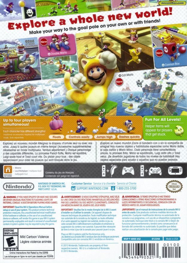 Elementos que caracterizam os jogos de Super Mario, tais como as moedas, estrelas mágicas mais ou menos escondidas, necessárias para atingir novos níveis, estão aqui. Novos são os selos escondidos, em quantidade de um por nível, para utilização com postes para Miiverse. Power-ups são igualmente beneficiados por Mario, Luigi, Peach e Toad, e incluem no seu número antigos clássicos como a estrela da invencibilidade e o fato Tanooki, modernos como o Mega Cogumelo e a Flor de Boomerang, e novas entradas: o Super Sino é um fato de gato: concede mais capacidades de ataque, velocidade de corrida, e agilidade na escalada de paredes, e desempenha um papel notável no jogo. A Double Cherry produz um clone do avatar, pelo que se pode duplicar as capacidades de ataque (até 4 Double Cherries, por uma soma de 4 clones, pode ser utilizado). A Máscara de Goomba permite o procedimento através do nível sem ser notado pelos inimigos. Há também objectos, como a Caixa de Hélice que permite voar pelo ar durante algum tempo, e o Sapato de Skate, que facilita a manipulação de personagens em áreas geladas. Os personagens começam níveis num estado Super Mario: descem para um estado Mario padrão, e tamanho, se atingidos; por outro lado, podem tornar-se enormes pelo Mega Cogumelo.