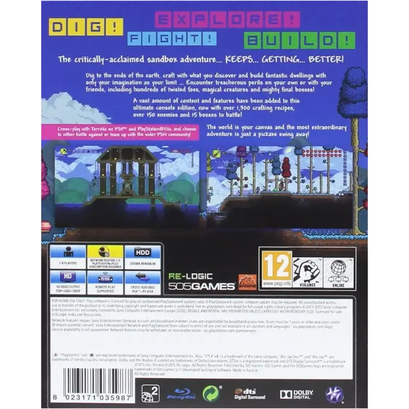 Terraria é um jogo de plataforma bidimensional de exploração e artesanato. Os jogadores podem utilizar minas e picaretas para recolher vários artigos do ambiente, incluindo madeira, minério e até teias de aranha. Os recursos adquiridos do ambiente podem ser colocados ou trabalhados em todo o tipo de artigos.