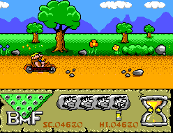 Parte 2: Conduzir o seu carro no caminho para o centro de bowling. Finalmente, quando todas as paredes estiverem pintadas, Fred pode ir para o centro de bowling! Fred tem de conduzir até à pista de bowling, mas infelizmente as estradas estão em muito mau estado. A superfície da estrada é terrível e coberta de rochas! E se uma das rodas bater com uma lomba, ela vai partir o carro e desaparecer ao longe.