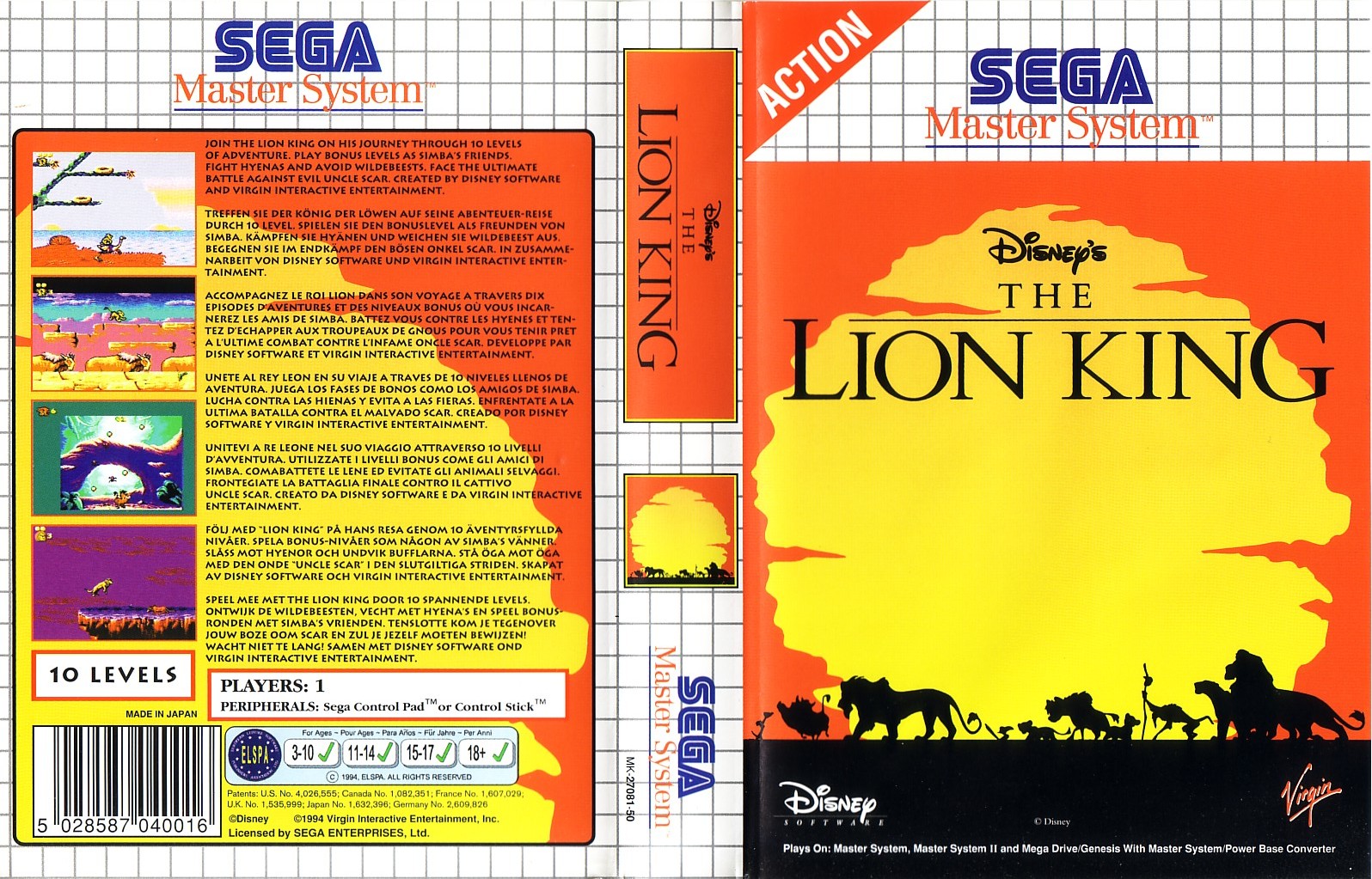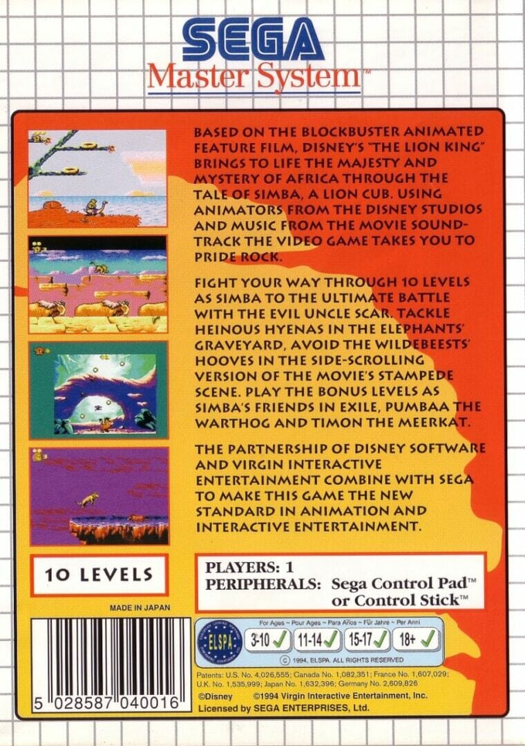 O Lion King é um jogo de plataforma de rolagem lateral baseado no filme animado da Disney com o mesmo nome. A versão para os sistemas 8-bit da Sega é baseada na versão 16-bit e tem a mesma jogabilidade geral e os mesmos temas de nível, mas os seus próprios desenhos de nível e outras diferenças.