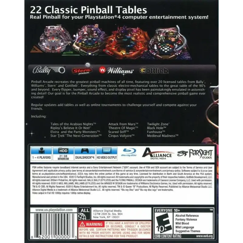 Pinball Arcade é baseado na série Pinball Hall of Fame e inclui simulações precisas de mesas de pinball de Gottlieb, Williams, Stern Pinball (que também inclui as suas encarnações anteriores: Stern Electronics, Data East Pinball, e Sega Pinball) e Bally. Estas duas últimas empresas não foram apresentadas anteriormente. Inclui quatro tabelas, uma de cada empresa, com suporte para tabelas adicionais através de conteúdo comercial descarregável. As tabelas incluídas são, na ordem em que aparecem no jogo:
