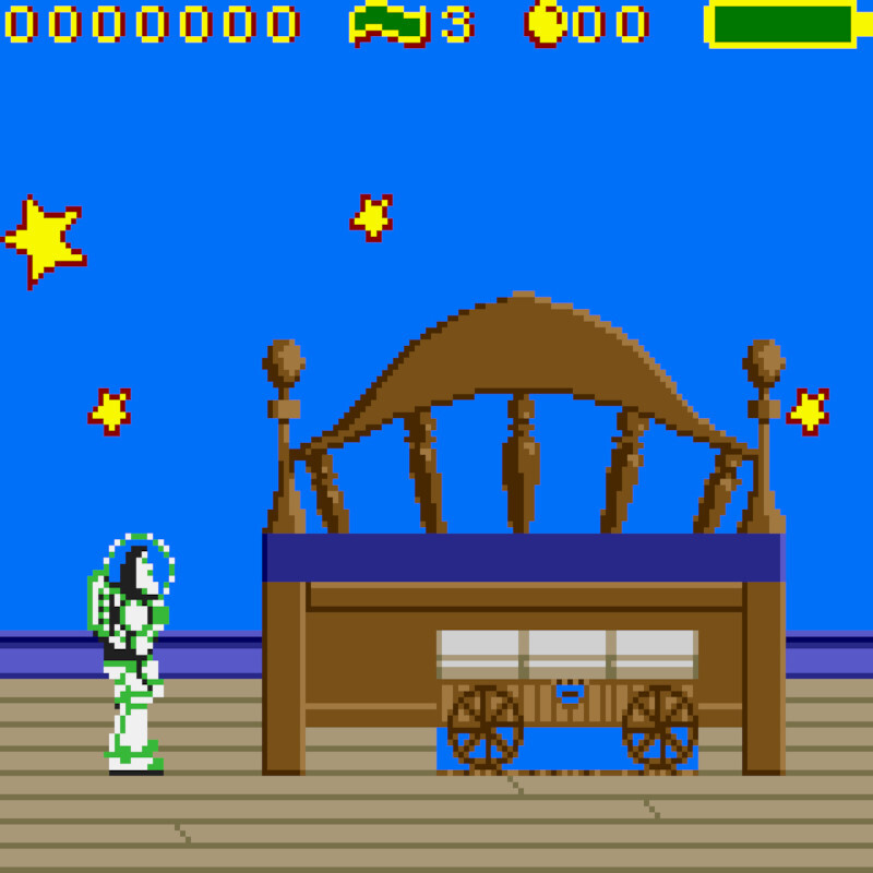 Os cenários incluem locais icônicos do filme, como a casa de Andy e a loja de brinquedos Al’s Toy Barn, além de outros ambientes que ampliam o universo do filme. A jogabilidade é desafiadora e exige exploração cuidadosa para encontrar itens colecionáveis e avançar nas fases.