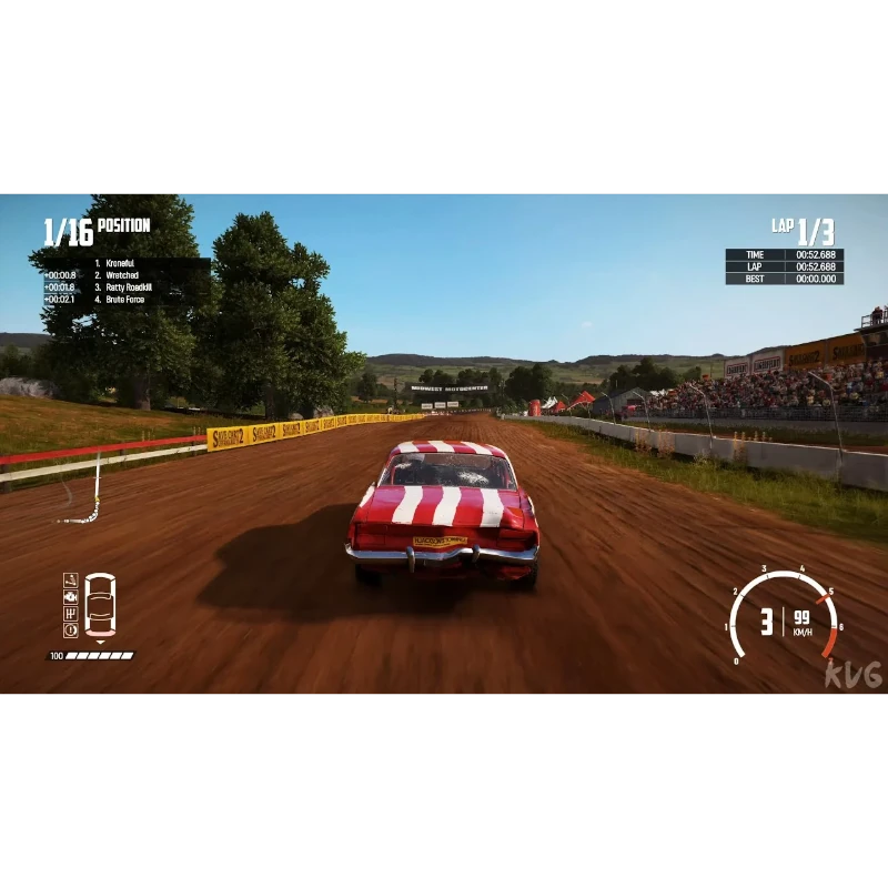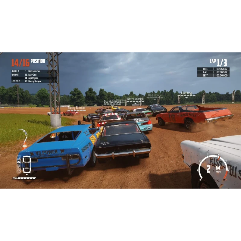 Wreckfest é um novo jogo de corrida com tema derby de demolição com modelagem de dano de corpo mole, dinâmica de direção sofisticada e atualização de veículos em profundidade, apresentando derbies de demolição e corridas de pista mais tradicionais.