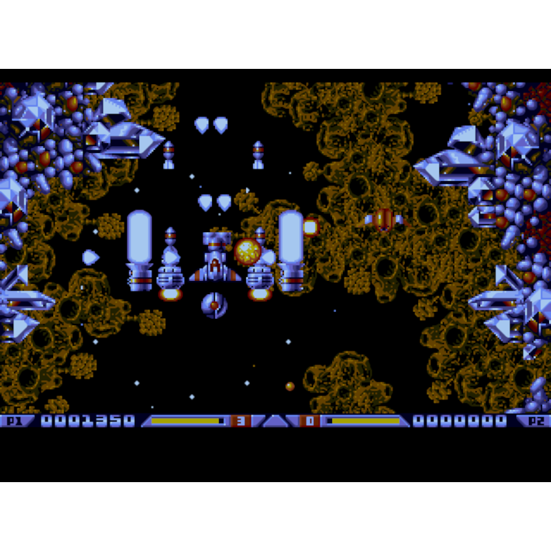A primeira parte do jogo tem um toque orgânico, enquanto a segunda parte do jogo apresenta inimigos mecânicos. Como existem algumas seções semelhantes a labirintos com becos sem saída no jogo, sua nave rola para trás quando você pressiona a tecla para baixo.